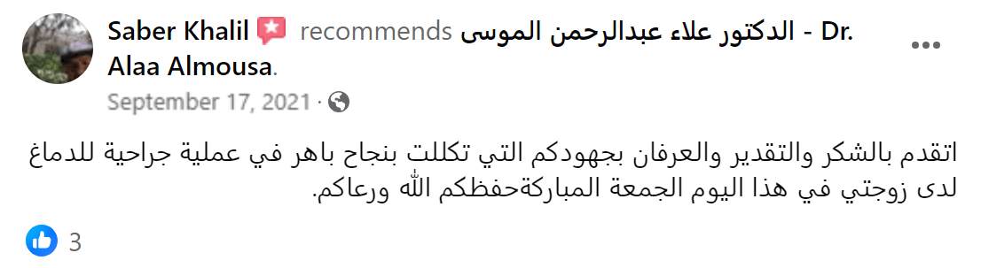 من لا يشكر الناس لا يشكر الله بفضل الله تعالى قد تم إجراء عملية جراحية على يد الدكتور علاء عبدالرحمن الموسى - Dr. Alaa Almousa Alaa Almousa صاحب الخبرة الكبيرة و الإنسانية المعطائه و من هنا ارسل له تحية اجلال و احترام و اشكر كل من تفقدني و اطمئن على صحتي من الأهل و الاصدقاء